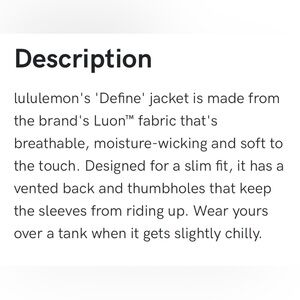 Love the Lululemon Define jacket! It is a classic! I have this jacket in many colors and have included pics in other colors to show how gorgeous this jacket fits the body. I love the fit!