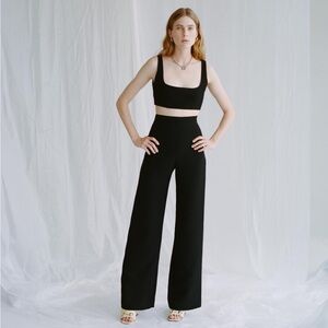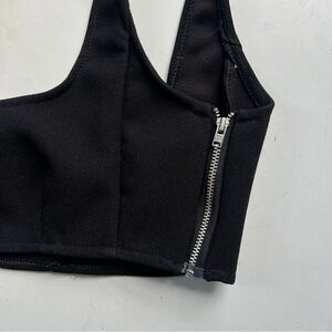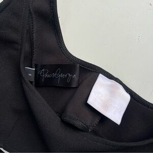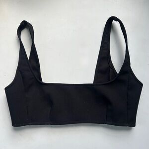 Paris Georgia black square neck bra top. In a sturdy crepe fabric with side zip closure. Gently worn, there is some discoloration on the interior tag but nothing visible when worn.