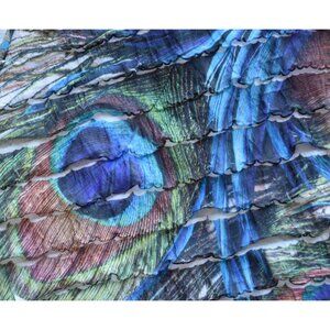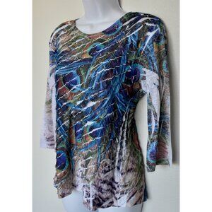 CURRENT/ELLIOTT RUFFLED BOAT NECK 3/4 SLEEVE PEACOCK PRINT MULTI BLOUSE. SIZE S
