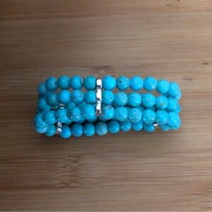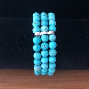 This Designer Stretch Bracelet has 3 Bands of Round Cut Howlite Gemstones with 3 Sterling Silver Spacers as well as a small designer tag from Shubes Manufacturing
