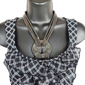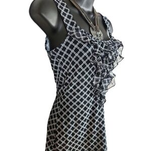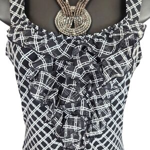 White House/Black Market, women's black and white plaid top, ruffle on front of the top, very elegant and form fitting, Sz XXS
