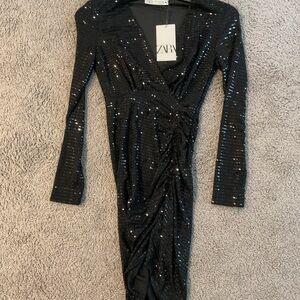 NWT Zara Black Bling Wrap Dress Cocktail Party Wedding Prom Formal Date-night sz XS, long sleeves, midi/mini pretty black sequin like bling dress! Will ship right away. Check out my other designer items.