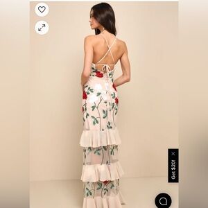 Follow your heart in the Lulus True to Heart Beige Floral Embroidered Ruffled Tiered Maxi Dress! Sheer mesh, decorated with ivory, red, and green floral embroidery, overlays this elegant maxi dress with a princess-seamed, surplice bodice supported by adjustable skinny straps that lace and tie atop an open back. Playful chiffon ruffles add flirty detail along the neckline and throughout the tiered maxi skirt. Hidden back zipper/clasp.