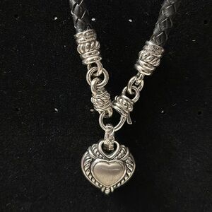 Fun Judith Ripka necklace! Black braided leather necklace with magnetic closure. Silver heart pendant with CZ center and intricate design. Can be worn with/without pendant.