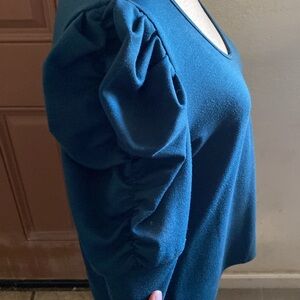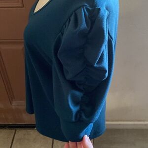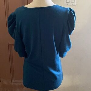Used but in good condition, ruffle, V Neck, top. I used this as a work top multiple times at the time when I use to work at my retail job at Macy’s. It’s very comfortable and I love the fluff ruffles on both sides. Perfect for office wear work, parties, outing’s, or casual wear, however you want. No holes, rips, tears, stain’s, snags, what’s shown on the pictures and video is how it looks except the top is more a darker teal blue color. Size S. No trades.