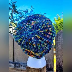 Warm hand knitted in brioche technique one of a kind beanie made of soft hand dyed merino wool yarn will add a bright and unique accent to your look. The playful style and texture of this stylish accessory will create a positive mood during the long, cool season.