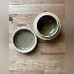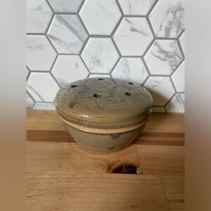 Beautiful handmade green glazed ceramic pottery bowl with lid and etched floral design.