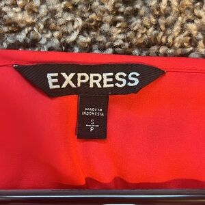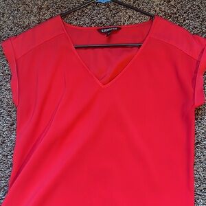 Gorgeous Express Coral Silky Blouse. This short sleeve blouse is in excellent condition. Beautiful coral color, longer length could easily be worn over leggings, jeans or skirts to work. You will love the way this top feels, 96% polyester, 4% spandex. Size S. Kept in a clean, smoke free, pet free home.