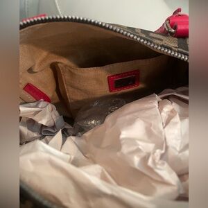 Monogrammed fabric with unique red accent leather! Barely used, like new luxury bag.