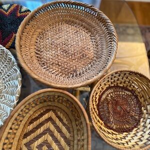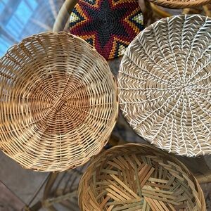Set of 8 assorted wicker and rattan baskets and trivets for a gallery wall