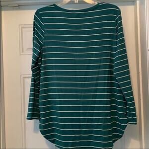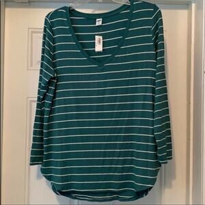 Teal Green & White Old Navy Long Sleeve Tee Condition: New With Tags Size: Medium •20 1/4” armpit to armpit •20 1/2” shoulder hem to bottom of sleeve •20” across bottom •25” length •1 3/4” longer length on back •slight high-low bottom •v-neck •very soft & stretchy •full-length long sleeve •scalloped bottom •color is a teal green •smoke free home A23 This item comes from a 5🌟 seller. Let me know if you have any questions.
