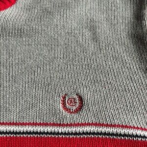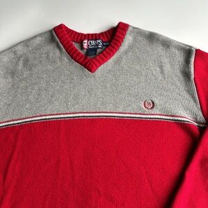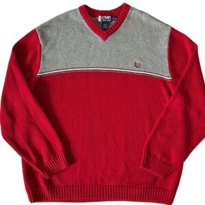Vintage Chaps Ralph Lauren Color Block V-Neck Cotton Sweater. Size XL. In excellent preowned condition and looks great for age. No visible flaws. Thick tight knit 100 percent cotton material. Color block gray and red and with stripe across chest. Chaps Ralph Lauren embroidery on chest. High quality thick feel in regards to material. No holes or marks. Classic and timeless style. See photo measurements to ensure a proper fit. Machine washable.