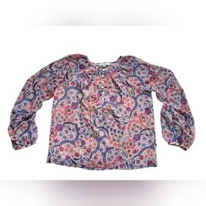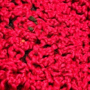 Handmade Crochet Hat Red Acrylic with Crochet Flower Appliqué in red, orange, purple and green. Some slight piling as shown.