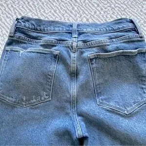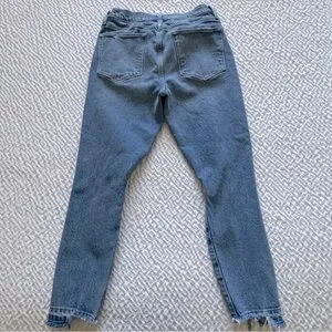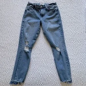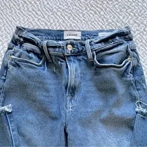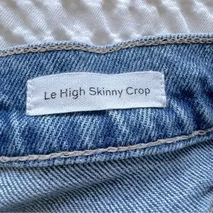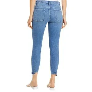 From FRAME, these are a pair of high rise, skinny leg jeans with a frayed, staggered, released hem. They are whiskered, faded, ripped and distressed with the rips perfectly placed. The crop length hits right at the ankle bone and is ideal for a 5’3” and under frame.