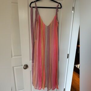 A statement-making dress that you'll wear all spring and summer long - meet Cary, a delightful rainbow dress from Sundress. Bold stripes, cut from colorful, shimmering, metallic thread fabric, adorn this midi. Self tie shoulders. Optional belt included.