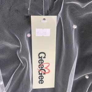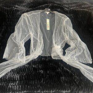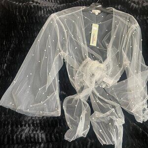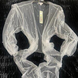 Charmingly feminine novelty front tie wrap with an array of stylish wear possibilities...looks equally great over a tee, strappy summer dress or bridal party gown. Though labeled size states "large", fit is actually quite flexible. Delicate tulle fabric does have a couple of snags near tagging at neck back.
