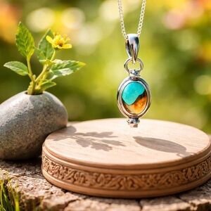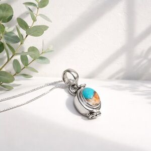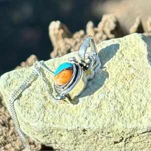 Genuine composite of spiny oyster and blue Mohave and set in solid 925 sterling silver poison pendant necklace