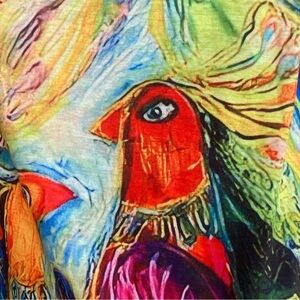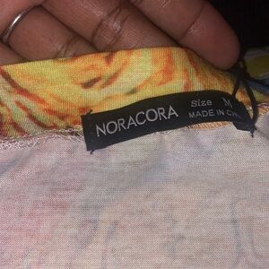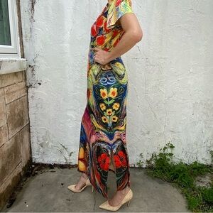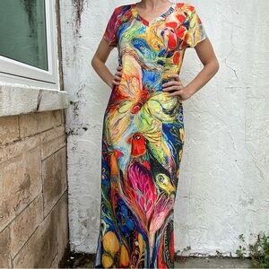 Noracora Long Maxi Peacock Multi Color Double Slit Maxi Dress! Measures 57in from top to bottom, has stretch, 20in from armhole to armhole model is a 6/8.