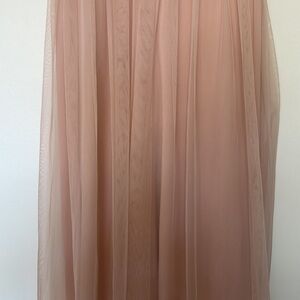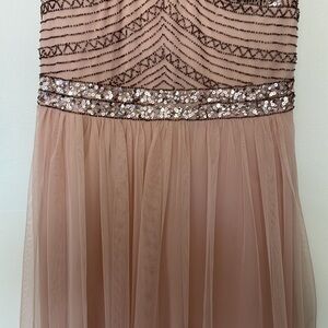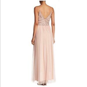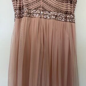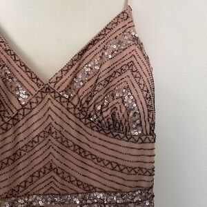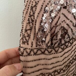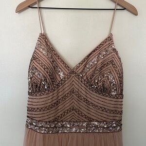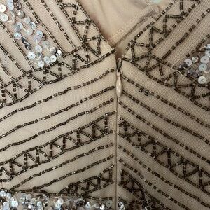 Description : Beaded and sequined embellished upper within thin, non-adjustable spaghetti straps. Art deco design on empire waist and long flowy pleated skirt with mesh overlay. Lined. Concealed zip in the rear. Flowy.