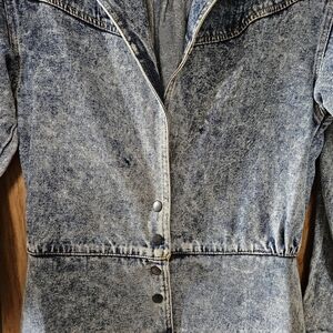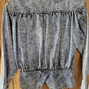 VTG Acid wash jean jacket with shoulderpads in a glam rock style. 4 buttons that come up about a 3rd of the way. Cute slit on the lower back with button details.