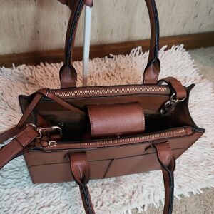 Elegant brown leather handbag with dual handles and adjustable shoulder strap. Features 2 side pockets and zip closure.