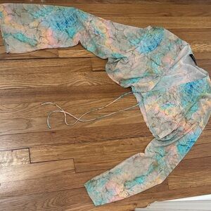 Size large top and size large bottom. Both run large. Top has broken size zipper. Skirt has high slit.