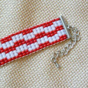 Handmade, handwoven bead loom bracelet made with glass seed beads and nylon thread. Silver-tone lobster-claw clasp and extender chain. Width is 3/4 inch. Length adjustable from 5 3/4 inches to 7 1/2 inches.