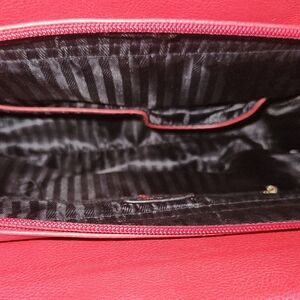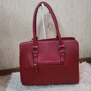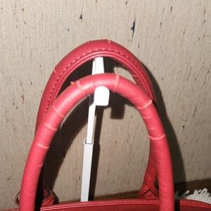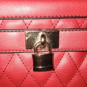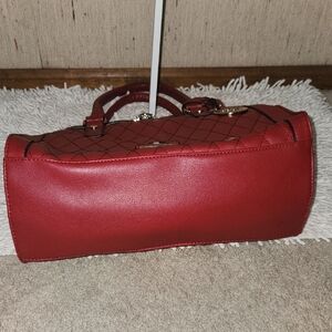 Elegant red quilted handbag. Features gold-tone hardware and a decorative charm. Double handles for easy carrying.