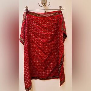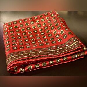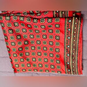 Women’s Vintage Classic Square Scarf. Rare Find! Preowned- good condition. Scarves are all the rage right now- and going old school with this classic style scarf will be the perfect accessory this fall and winter! The color of the scarf is like an autumn red with dark green and light yellow golden rod like clover pattern design. Wear with a blouse, a cardigan, your blazer, trench coat, dress up your satchel; or get creative and wear as a hair accessory. Material: Polyester. No brand tags/ fabric ingredients etc. Approximate measurements: 27 inches long x 26 inches wide.