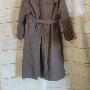 Gray double breasted and belted trench coat with removable wool blend liner. Structurally in great condition. Refer to last photo for white stain near the hem. Think it might just be snow de icer. I haven’t tried washing/dry cleaning to have it removed.