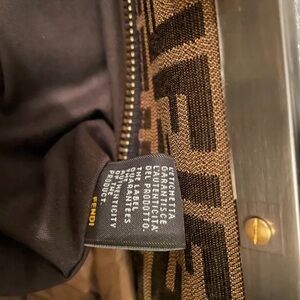 Featuring two internal compartments divided by a stiff partition and an internal pocket with gold-finish FENDI logo. Has the gold-finish clasp and metalware, iconic twist lock with gold/black finish FENDI logo on both sides.