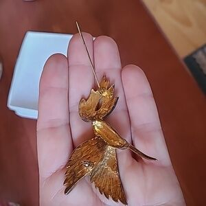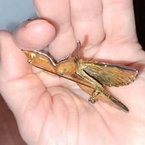 Beautiful Vintage Hummingbird Brooch. Green Enamel with Gold-tone & Rhinestones. On bottom tail Feather, a stone appears replaced (looks yellow, see last photo.) The pin latch is loose but still works. Some wear to back finish, normal for a used piece. Impressive size! Unknown age.