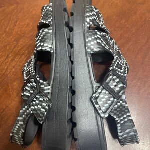 Elevate your summer footwear game with these stylish Skechers Foamies Free Spirit sandals. The black geometric pattern, hook & loop closure, and adjustable strap make them the perfect combination of fashion and comfort. These sandals are ideal for any occasion, whether it's travel, activewear, or casual outings. The low wedge heel, cushioned insole, and lightweight design make them a must-have for the fall and spring seasons. The Skechers Footsteps product line guarantees durability and quality, while the synthetic upper and lining material provide additional comfort.