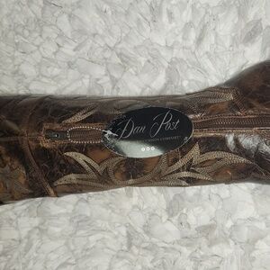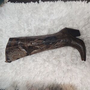 The Jilted boot is a show stopper with an over-the-knee, 20 height. Handcrafted with soft, distressed leather and western stitching throughout. It's dressed up with a high fashion heel, snip toe and leather outsole. An inside zipper makes it easy to step in and go.