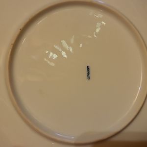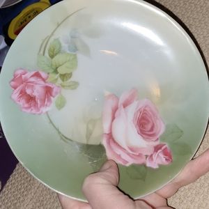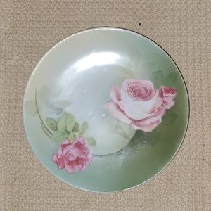 Pre-WWII (1914-1945) Antique Vintage RS Germany 6.5" bread/dessert plates. One plate has blue RS Germany backstamp, and "Germany" impressed on back; the other two are simply marked "Germany." Gorgeous Pink Roses on a green Ombre background. Excellent used condition, please see pics: one plate has a long scratch across about 1/3 of plate, rather faint. This plate also has several "dimples" which are factory flaws. One other plate has a single "dimple" (last pic.) Beautiful to display or use!