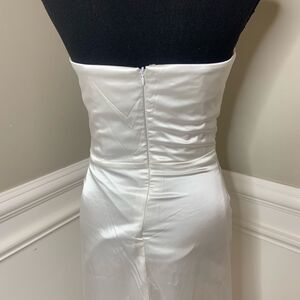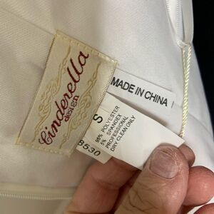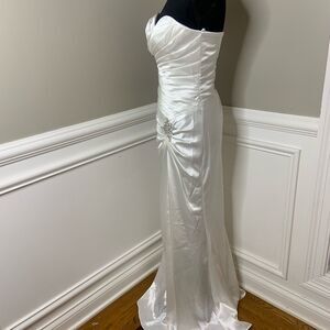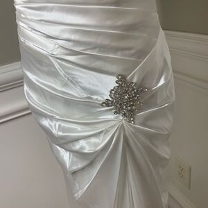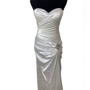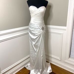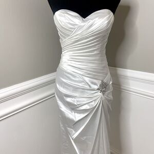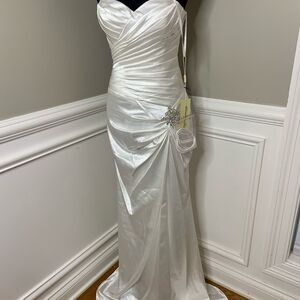 NWT Cinderella Design satin sheath cut wedding dress size small. This beautiful dress has never been worn. It has gorgeous, rouching, a beautiful silhouette. The rhinestone embellishment is a pin that can be removed. Size small measurements for this brand in last photo. Comes with attachable straps if desired. Sweetheart neckline cut. Smoke free home, no flaws. Also great for prom or a formal.