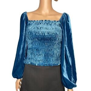 Anthropologie Puff-sleeved Velvet smocked Blouse blue size S NWT boho