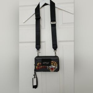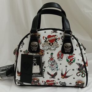 This rare gem of a bag has an orange lining accented with white skulls, triangles, and hearts.