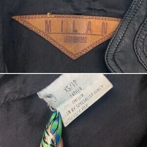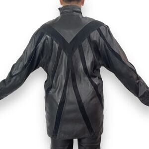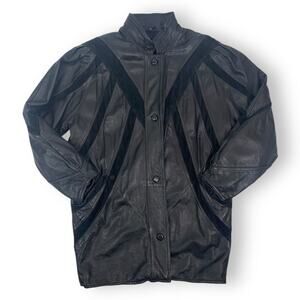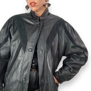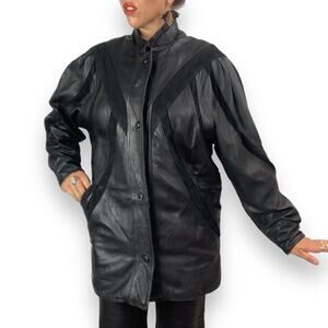 Vintage MILAN LEATHERWEAR long black leather and suede jacket. Genuine black leather with black suede abstract trim detail. Snap closure up the front. Two deep comfy side pockets. Mockneck rise. Pleated leather detail at shoulders. Fully lined in black viscose fabric. Excellent vintage condition with minimal signs of wear! Marked size XS but runs big and can fit anywhere from an XS - Medium. For reference, model is 5'8", size 8, 34C and 150 lbs.