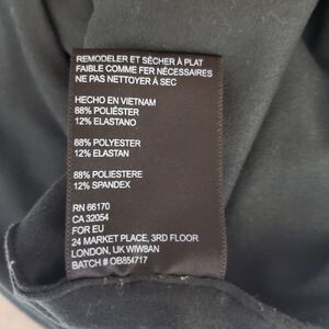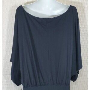 Blouson top half with dolman sleeves and a boat neck. Elastic waist. Bottom half is fitted like a bodycon. Good amount of stretch. Belt loops, but no belt is included. This is in very good pre-owned condition. No holes, snags or tears.