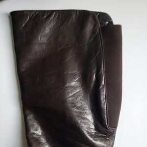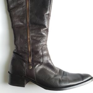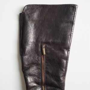 Low-heeled brown knee high leather boots by Browns Shoes feature a crinkled leather, rounded pointed toe, zip and pull tab on outer shaft, bronze-coloured decorative hardware, U-shaped elasticized gusset at calf and lined with a fleece-like fabric throughout to keep your feet toasty.