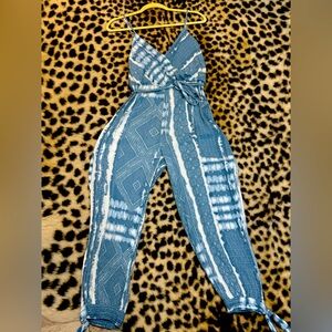 Adjustable straps, slits on the sides of the leg andtie belt. This jumsuit is absolutely so cute. It’s from Vici and a size large- which is more like. 6-8.
