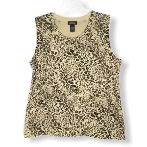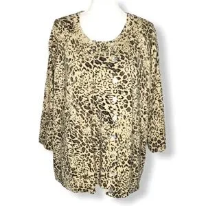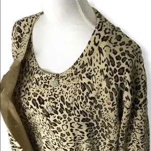 Animal print cardigan set in excellent condition! Looks like it’s never been worn. Soft sweater fabric with some stretch. Tan background with brown and black animal print. Has 9 shell buttons going down the front. Round neck line.