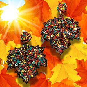Fall Autumn Theme Colorful Maple Leaf Seed Beaded Statement Earrings