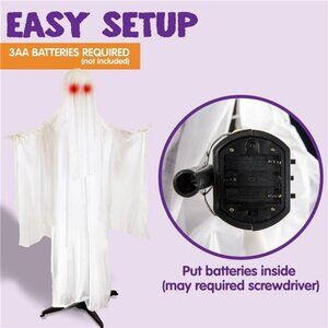 ANIMATED HALLOWEEN DECORATIONS: It is equipped with the sound that will activate its creepy sound, flashing eyes, and shaking body. With the classic white attire, this Halloween prop looks more realistic. 3 AA batteries required (NOT INCLUDED)