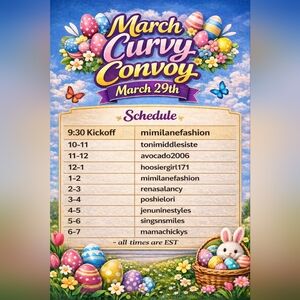 Good Morning Sweet Friends. I will be kicking off the Curvy Convoy this morning at 7:30 am est followed by Ck880 @8, ladidi912 @9, kayyyyyybeeeeee @10, poshielori @11, needful_things_ @12, hoosiergirl171 @1, mitten_girl @2, sneakynix @3, @last_call_chloe @4, singsNsmiles @5, amybug30 @6, mimilanefashion @7. At the end of my show 8pm est, we will have a Buyer Appreciation drawing for 3/$50 giftcards. You can qualify for an entry if you spend at least $20 with any seller and present to win.