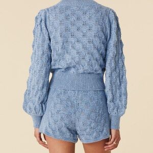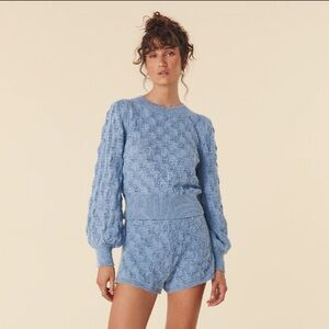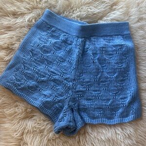 Spell, Bonfire knot shorts. Blue. Size XS. New without tag, only tried on. Very stretchy, comfy waistband. Gorgeous knit crochet detail. Super soft. Can be worn with their matching sweater, the solstice blouse, and a coordinating Spell tee!