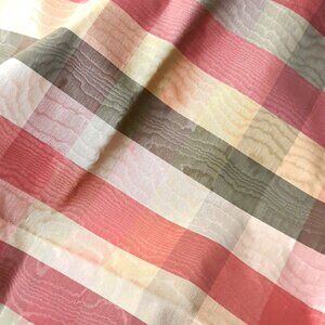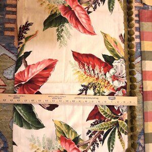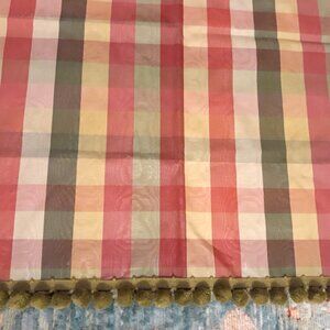 Charming, quirky, cheery curtain set for a small window made by me of gorgeous, nubby vintage tropical barkcloth, sumptuous, coordinating checked moire, and vintage 1" ball fringe. Had this hanging in my laundry room of our lakeside cabin briefly, but husband passed away, & I had to sell the cabin, so I no longer need this sweet, little curtain. Sorry I don't have a rod to hang it on for a better visual display. It's different, & an odd combination of fabrics & patterns, but it works.