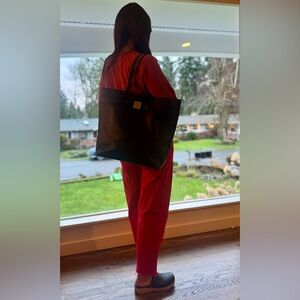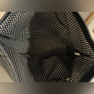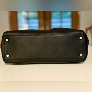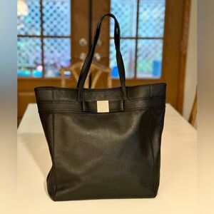 Kate Spade Black Leather Tote with a small leather bow with a silver center. This is a large tote bag, can carry a laptop.