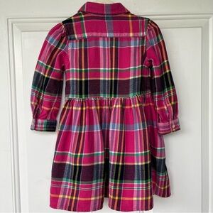 This is an adorable long sleeved dress from Ralph Lauren, little girl’s size 18 Months. The soft brushed flannel fabric, 100% cotton, is a plaid in raspberry pink and blue, with touches of yellow, green, and white. Features a button down front, collar, gathered skirt, and buttons at the cuffs. A timeless classic with great Ralph Lauren quality!